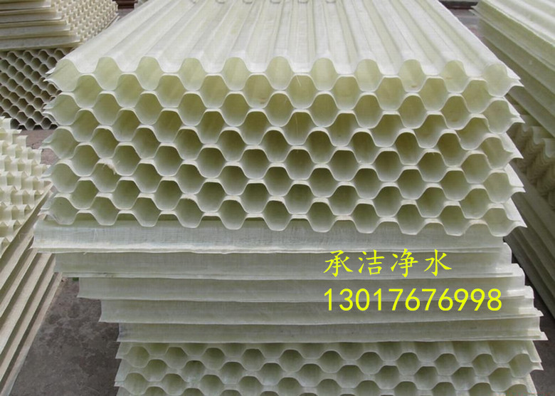 8、斜管填料沉淀裝置采用乙丙共聚、玻璃鋼或聚氯乙烯蜂窩斜管填料,傾角為60℃,斜長1m,內(nèi)切圓直徑為35-50mm不等,根據(jù)水質(zhì)可以改變內(nèi)切圓直徑,以達(dá)到最佳沉淀效果。
